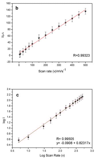 Figure 8a illustrates the cyclic voltammograms of GCE-MWCNT-CoPc in the presence of EE at different scanning rates. It can be verified that in the cyclic voltammograms there is no peak during reverse sweep, so this process indicates an irreversible behavior.