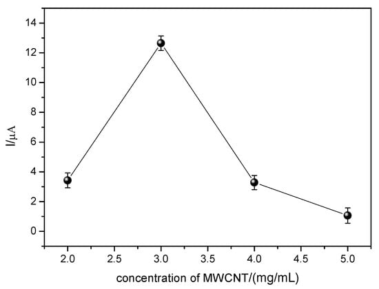 It can be observed that the MWCNT led to a higher current variation of the analyte, and this may be related to its main properties such as high surface area, high electrical conductivity, chemical stability, and mechanical resistance. The MWCNT-CoPc system has a synergistic effect, which includes the high mediator and catalytic power of CoPc without losing any of the electronic properties of MWCNT [24].