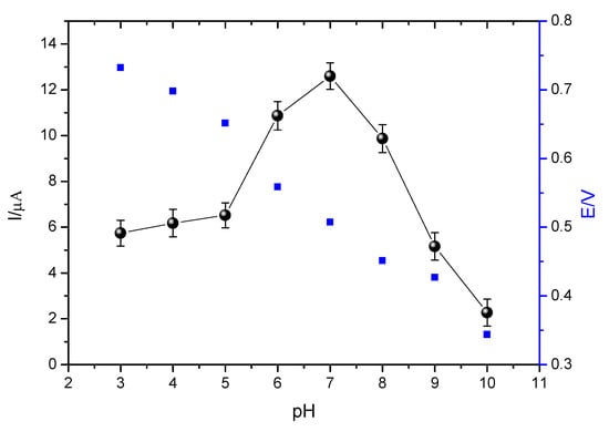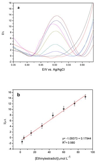 The proposed sensor presented low scan rate (10 mV s−1) δ0.5 around 45.56 mV, replacing this value in Equation (3) mentioned above, the value of ne is approximately two electrons. In the literature [5], the oxidation reaction of ethinyl estradiol involves the transfer of two electrons and two protons, corroborating with the value of ne and calculated in this work.