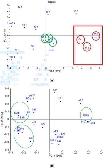 It was established that the use of three principal components described 90% of the data: the most important were the first two principal components, representing (respectively) 36% and 24% of the overall system variance, as seen in Figure 5. On the scores chart (Figure 5A), two separate sample groups can be distinguished: the first one was formed by samples #04, #05, and #51, which were the most different from the rest of the analyzed samples; while samples #47, #02, and #41, the classification of which was virtually not influenced by the selected variables, constituted the second group. When comparing scores and loadings charts (Figure 5), it was established that the quantitative output data—mainly the “visual fingerprints” areas—had the greatest impact on the identification of samples #04, #05, and #51. The output data for the first sensor had the greatest impact on the discrimination of samples #39, #40. #42, and #49, and this result indicated the presence of volatiles (organic trace impurities containing oxygen) with a high affinity to the oxidized MWCNT coating of Sensor 1.
