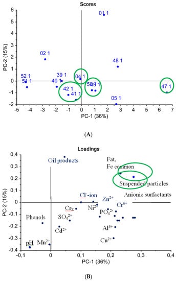 From the loadings graph (Figure 6B), it can be established that the “suspended solids” and “anion-active surfactants” variables were the most discriminative along the first principal component, PC1, while the “petroleum products” content and the “hydrogen index” were the most influencing variables along axis PC2. Moreover, the water mineral composition indicators were correlated with each other and did not influence the sample classification.