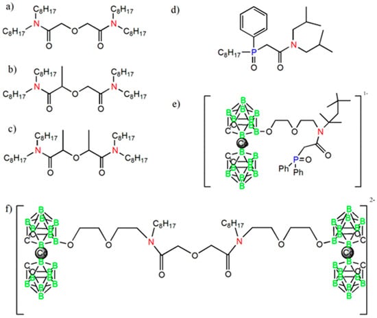 - Grüner, B.; Kvíčalová, M.; Selucký, P.; Lučaníková, M. Anionic alkyl diglycoldiamides with covalently bonded cobalt bis(dicarbollide) (1-) ions for lanthanide and actinide extractions. J. Organomet. Chem. 2010, 695, 1261–1264. [Google Scholar] [CrossRef]