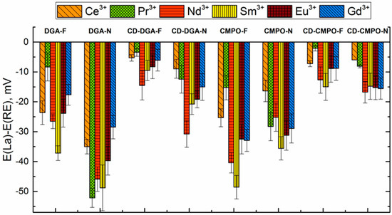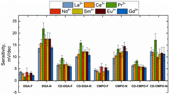 - Legin, A.V.; Kirsanov, D.O.; Babain, V.A.; Borovoy, A.V.; Herbst, R.S. Cross-sensitive rare-earth metal sensors based on bidentate neutral organophosphorus compounds and chlorinated cobalt dicarbollide. Anal. Chim. Acta 2006, 572, 243–247. [Google Scholar] [CrossRef] [PubMed]