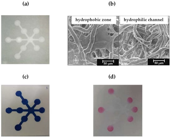 Paper-based analytical devices are a new technology [1,2,3]. They have many practical applications due to their simplicity and portability, low cost and reduced sample/reagent consumption [4,5]. Thus, microfluidic paper-based analytical devices (µPADs) have been widely applied in such fields as medicine [6,7,8], the food industry [9,10,11], and environmental fields [12,13,14]. Multiple processes can be applied to create a hydrophobic barrier on paper, including photolithography [15,16], light irradiation [17], plasma treatment [18], laser cutting [19], stamping [20], inkjet printing [21,22], wax printing [23,24], and screen printing [25,26]. However, photolithography, plasma-treatment, laser-cutting, and inkjet-printing techniques have some limitations, such as expensive fabrication instrumentation, multi-step fabrication processes, and long fabrication times [27]. Wax printing enables easy fabrication and low cost but requires a heating step that causes the wax to spread, decreasing the feature resolution [27,28]. Alternative materials such as polymer solutions, polystyrene [28], polydimethylsiloxane [29], and polycaprolactone [30] have been used to create hydrophobic regions on μPADs to overcome wax material’s drawbacks. This technique provides high resolution and repeatability.