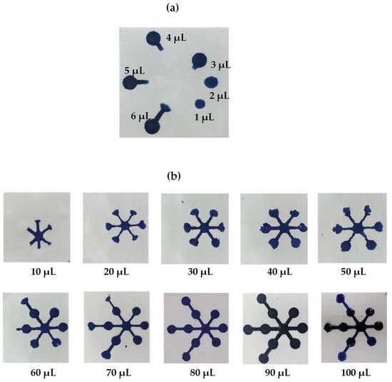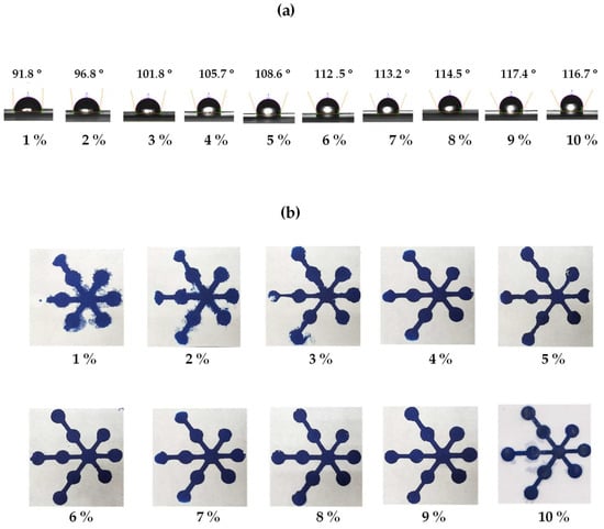 The polylactic acid concentration influenced the resolution between the hydrophobic and hydrophilic areas of the μPADs. Thus, the concentrations of polylactic acid were optimized at 1 to 10% w/v on the front and back of the paper. The contact angles of water on the paper were measured to examine the hydrophilicity and hydrophobicity of the paper. As the results show in Figure 4a, all concentrations of polylactic acid provided a contact angle higher than 90°, meaning that hydrophobic surfaces were formed on the paper [42]. At concentrations less than 9%, low contract angles were obtained, resulting in incomplete hydrophobic barriers (Figure 4b). On the other hand, at concentrations exceeding 10%, the contact angle decreased because a high-viscosity polylactic acid solution makes it difficult to penetrate through the paper, leading to reduced reproducibility of the hydrophobic barrier’s dimensions. Thus, 9% was selected as the optimum polylactic acid solution concentration because it provides the best hydrophobic pattern.