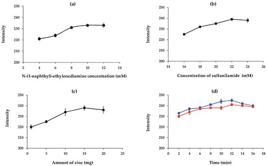 Effects of (a) N-(1-naphthyl)-ethylenediamine concentration and (b) sulfanilamide concentration on 10 mg L−1 nitrite detection as well as of (c) amount of zinc for 50 mg L−1 nitrate detection and (d) reaction time for 10 mg L−1 nitrite (blue line) and 50 mg L−1 nitrate (orange line) detections (n = 3).