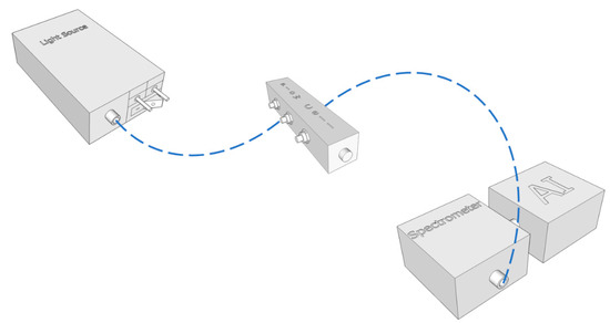 A compact benchtop system was built using a D2 (deuterium) light source (Ocean Optics model DH-2000-BAL), a spectrometer (Ocean Optics model HR4000), a transmission optical fiber bundle (UV), and a stainless steel slitted reflection probe for insertion on samples and/or sampling chambers. The design of the experimental setup is represented by the schematic of Figure 1.