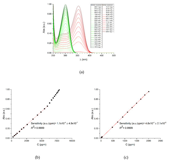 Considering our DUVA calibration results, the UV-Vis raw data allows us to infer that a linear correlation exists (Figure 3a) within a certain range limit: in our case, up to 6000 ppm of NO3− (Figure 3b) and 2000 ppm of NO2− (Figure 3c), after which the deviations are evident.