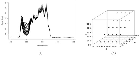 Figure 5a shows the corresponding recorded spectra in the UV-Vis region (200 to 600 nm) of the factorial design samples. As expected, most of the systematic spectral variation occurs at 250 to 350 nm, and, to a lesser extent, to 500 nm. This figure provides evidence that information about P and K is present, because, even to the naked eye, one can observe that there are more spectral patterns in the region of 250 to 350 nm than the expected nitrogen levels of the experimental design; that is a good indication that the interferences between all the constituents are being registered on the spectra. The correlation of the different levels among the NPK nutrients of the matrix design, can be represented as displayed by Figure 5b.