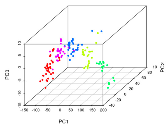 Figure 6 presents the principal component analysis of the factorial design spectra. The main cluster groups are distinguishable by different colors and are comprised of higher to lower concentrations of total nitrogen. Within each nitrogen level, a high dispersion is observable due to the interference of the other constituents of the different mixture levels between T0, T1, and T2.