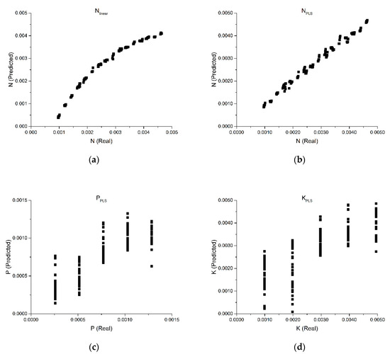 A similar result is obtained for potassium, with a correlation of 0.7982 and an MAPE of 34.84% with 3 LV (Figure 7d). Despite the correlation confirming that the spectra carry information about phosphorus and potassium, the high dispersion of errors do not allow the use of standard chemometrics PLS-R as a method capable of providing analytical quality results (e.g., correlations >0.95, MAPE <5.00%). The PLS-R analysis demonstrates that considering all interference modes to build a global calibration model for NPK leads to high-variance in predictions and low accuracy, especially for lower absorbance of P and K that contribute much less to spectral variance.