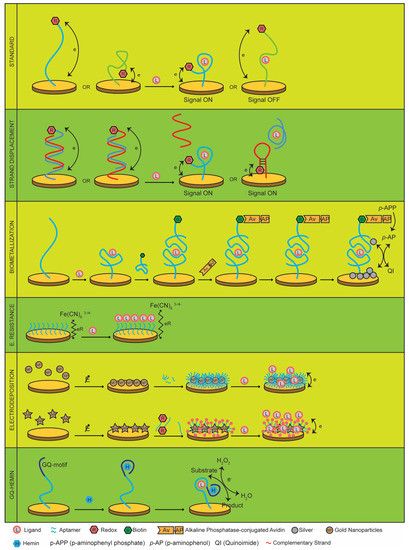 In the last few years, we have witnessed novel developments in electrochemical biosensors and their translation from bench to commercial devices; however, a key is the lack of systematic screening technology to discover novel molecules for biosensing applications. Aptamers are an interesting class of oligonucleotides, larger than small molecules but smaller than antibodies, with specific binding affinities toward a variety of targets [64,70,71]. Most aptamers show large conformation changes upon ligand binding, which makes them ideal molecules for electrochemical biosensing, and many original developments have been published by academic laboratories. In general, it is possible to classify the aptasensor architectures according to their different designs—(1) Standard, (2) Strand Displacement, (3) Electrotransfer resistance, (4) Electrodeposition, (5) GQ-Hemin, (6) Continuous, (7) Real-time, and (8) Biometallization. However, commercialization of electrochemical biosensors has lagged behind academic output, probably due to technical barriers and cost-effective manufacturing methods. Some technical barriers include sensitivity, signal-to-noise ratio, reproducibility, and shelf life. Furthermore, cost-effective manufacturing methods include access to raw materials, variability among material batches and their effect on the device performance, and the compatibility of the sensing elements with standard electronic manufacturing procedures. Although many challenges must still be overcome, aptamers have great potential as probes for commercial electrochemical affinity-based biosensors.