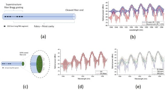 FBGs are grating with grating period in the sub-micrometer range []. These gratings are designed to reflect light of a specific narrow wavelength band with center wavelength called the Bragg wavelength. A normal uniform FBG is not inherently sensitive to ambient RI as it mostly influences the core guided modes that are tightly confined in the fiber core with no interaction with the ambient environment. However, fiber sensitization techniques such as fiber tapering [,] and cladding modification [,] can be employed to sensitize the Bragg grating.