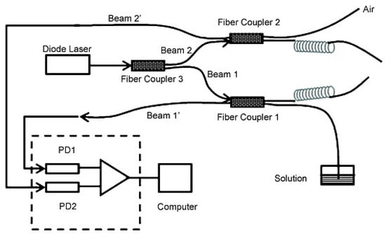Reflection at the cleaved end of an optical fiber is a function of the RI mismatch between the optical fiber and the ambient environment according to Fresnel’s law. Therefore, RI of the ambient environment can be determined if the effective RI of the optical fiber is known. However, when this reflected power from a single strand of optical fiber is used to measure RI of the ambient environment, power fluctuation of light that reaches the optical fiber end caused by numerous factors such as bending loss and instability of light source contributes severely to inaccuracy, making it infeasible in real-world applications. To compensate for these inaccuracies, a ratiometer setup was proposed [,]. This design consists of two strands of optical fiber guiding light from the same light source split by a 50:50 optical coupler (Figure 2). The propagation path and power of light that reached the end of the two fiber ends are therefore ideally identical.