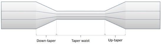 The most fundamental microfibers sensors as illustrated in Figure 3, are generally fabricated to operate in single mode from single mode fiber, while works on multimode fibers have been reported [,,]. Given a suitable design of tapered slope and waist and length, a portion of the fiber guided optical power extends out of the fiber structure into the ambient environment as evanescent wave. The extent of light that propagates out of the fiber structured and guided along the fiber is determined by wavelength of light, slope of taper, and diameter of waist []. This structure is known as a biconical microfiber, the most basic of microfiber RI sensors []. Tapered microfiber can be of an adiabatic or nonadiabatic profile. Design considerations are well discussed elsewhere [,].