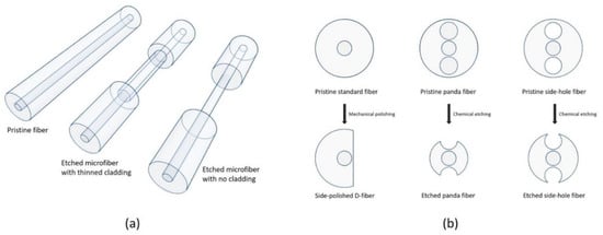In general, these sensors are interferometric. For uniformly etched devices as seen in Figure 5a, an interference similar to that of a tapered microfiber is formed. As light propagates from the unmodified length of the optical fiber to the cladding reduced/removed portion, higher order modes (ambient exposed modes) are excited and propagates along the length of the modified fiber. These modes propagate at different propagation constant due to the RI mismatch in the medium they are propagating in. Therefore, the modes couples back into the fiber in different phase, forming an MZI. On the other hand, the non-uniformly etched fiber devices as in Figure 5b are also interferometric but the interfering modes are generally the orthogonal polarization modes guided in the fiber core, partially exposed to the ambient environment in one of the polarization axis more than the other due to the fiber’s physical structure.