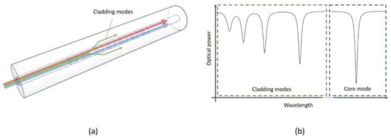 As its name suggest, the grating period of the LPFG is long (see Figure 6), relative to FBGs, general in the sub-millimeter range. LPFGs are inherently sensitive to ambient RI as it is a device designed to couple core guided modes into the fiber cladding as forward propagating cladding modes. These cladding modes are guided within the cladding with the principle of total internal reflection satisfied at the cladding to ambient environment boundary due to the RI mismatch. Some of the higher order cladding modes also extends out of the fiber, directly interacting with the ambient environment. As the total internal reflection conditions of all cladding modes and propagation constant of the higher order modes are a strong function of the ambient RI, the resulting transmission spectrum of the LPFG is representative of ambient RI change [].
