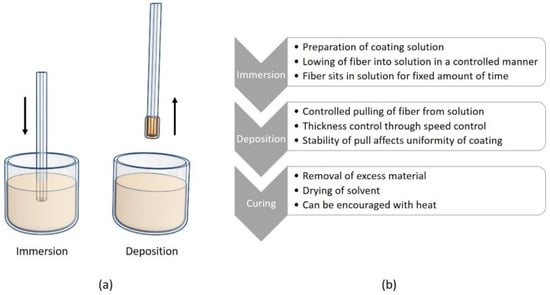 Dip coating of an optical fiber as shown in Figure 8, can be carried out either on the fiber end or along the fiber length []. It typically involves three steps. Before the actual process, the fiber surface is first prepared by removal of protective coating and cleaning with a solvent. The coating solution is prepared in a suitable process depending on the material.
