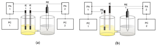 Schemes for measuring potential (a) of two indicator electrodes (IE 1 and IE 2) with respect to one reference electrode (RE); (b) one indicator electrode (IE) relatively to two reference electrodes (RE 1 and RE 2). PA 1 and PA 2: potentiometric analyzers; PC 1 and PC 2: personal computers; IE 1 and IE 2: modified AgSPEs; RE = RE 1: EVL – 1M3.1; RE 2: QREmix.