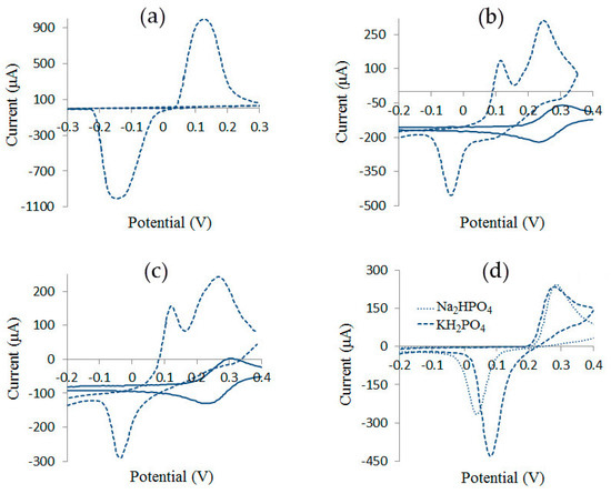 Figure 2 shows cyclic voltammograms describing the redox processes on AgSPE in solutions of KCl, K4[Fe(CN)6], K3[Fe(CN)6], Na2HPO4 and KH2PO4, which are components of the solution used. Cyclic voltammograms for Pt are also shown for comparison.
