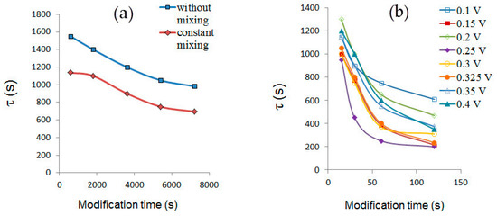 Figure 3 shows dependences of the modified AgSPE potential stabilization time (τ) on modification duration. As can be seen from Figure 3a, potential of an open-chain modified AgSPE with solution stirring stabilizes faster than without solution stirring. Minimum τ values for open-chain modified AgSPEs are observed at modification duration of 7200 s (2 h). Parameters τ, ΔE/Δt, E1, E2, E3 for AgSPE modified in an open circuit without solution stirring are poorly reproducible. Potential stabilization time of AgSPE modified in the potentiostatic mode decreases with increasing of modification duration (Figure 3b). Minimum τ values are observed after modifying electrodes for 120 s. Results in which standard deviation of one or more parameters E1, E2, and E3 exceeds 3 mV are excluded from further consideration, since they do not satisfy necessary conditions. Results in which standard deviation of the parameters E1, E2 and E3 is less than 3 mV are shown in Table 3.