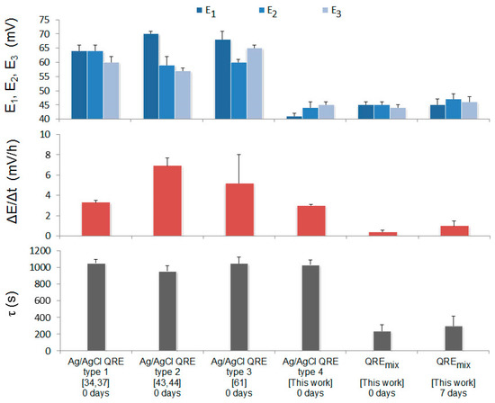 Experimental values of the parameters (τ is potential stabilization time, ΔE/Δt is potential drift and E1, E2, E3 are potentials values) characteristic for QREmix and Ag/AgCl QREs depending on the electrodes storage duration before measurements. The boundaries indicate upper values of standard deviation for α = 0.05 and n = 4.