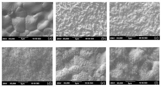 Figure 5 shows SEM images of AgSPE surface (Figure 5a) and AgSPE’s surface, which are formed at a potential of 0.325 V in non-containing and containing [Fe(CN)6]3–/4– solutions (Figure 5b,f). AgSPE surface is a conglomerate of polydisperse crystals 2–10 μm size (Figure 5a). Ag/AgCl QRE type 4 and QREmix surface (Figure 5b,c) consists of polydisperse large (0.4–1.8 μm) crystals. Fine crystalline precipitates form on AgSPEs obtained in [Fe(CN)6]3–/4– solutions (Figure 5d,f). Probably a fine-crystalline precipitate leave out, mainly of Ag3[Fe(CN)6], leave out as shown earlier (see Section 3.1), fills pores between large AgCl crystals, which leads to an improvement of QREmix stability compared to Ag/AgCl QREs.