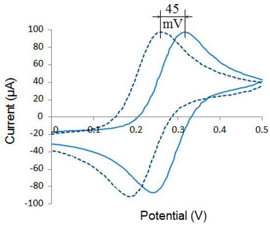 Cyclic voltammograms recorded on Pt in a solution containing 1 mM [Fe(CN)6]3–/4– (1:1) and 1 M KCl using EVL–1M3.1 or QREmix as a reference electrode are shown in Figure 6. It is seen that the obtained cyclic voltammograms are almost identical and differ only in a parallel shift along the potential axis by 45 ± 3 mV (n = 4), which corresponds to the potential difference between EVL–1M3.1 and QREmix. This is one more evidence of QREmix stable operation in a solution containing [Fe(CN)6]3–/4–. It may contribute to the use of this electrode for other electrochemical applications.