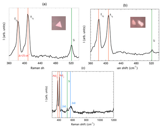 Raman spectroscopic studies were performed to evaluate the number of layers of the material and the potential damage induced by ZnO sputtering. In fact, the energy difference between the two Raman peaks E2g, which represents the in-plane vibrational mode of the Mo and S atoms, and A1g, which represents the out-of-plane vibrational mode of S atoms [40], can be used to identify the number of layers of the MoS2 flake under observation: a distance equal to 18 cm−1 is the fingerprint of a monolayer MoS2 flake, while it gradually increases with number of layers up to 25 cm−1 for multilayers [9]. Figure 4a shows the Raman spectrum of the triangular flake A reported in the SEM image in Figure 3a in the inset, as visible from the optical microscope with a 100X objective. The distance between the E2g(383.7 cm−1) mode and A1g (408.5 cm−1) mode is 25 cm−1, indicating the formation of predominately multi-layer MoS2.