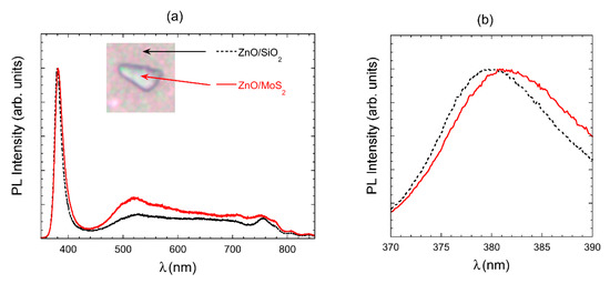 (a) Photoluminescence (PL) comparison of ZnO growth over MoS2 and ZnO over SiO2. The inset reports the optical image of the scalene triangle, with the position of spectra acquisition. (b) Close up image of the near band emission (NBE).
