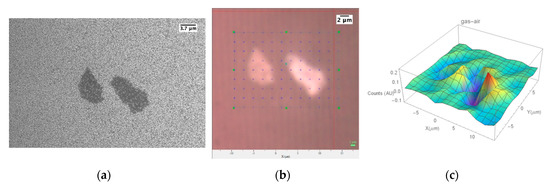 MoS2 was mechanically exfoliated onto SiO2 on a Si substrate, producing isolated flakes like the one shown in Figure 3a. The pictured specimen is an isosceles triangle with a side of 12 μm, but several smaller flakes are also visible all over the substrate. After inserting the sample into the sputtering plant, Sn was deposited first, keeping the substrate at a temperature ranging from 200 to 250 °C. The sputtering power and time for Sn were kept constant at 50 W and 5 s, respectively. The deposition of ZnO from an oxide target was carried out as the last step. We tailored the deposition of ZnO to substrate temperatures lower than 300 °C, in order to preserve the MoS2 structure.