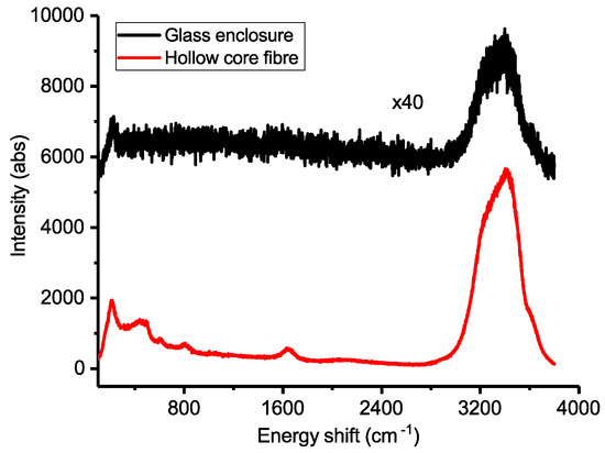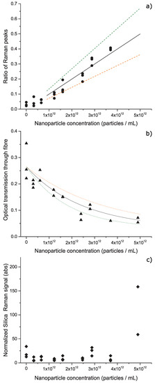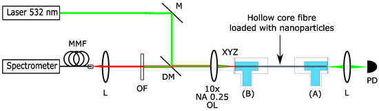 - Irizar, J.; Dinglasan, J.; Goh, J.B.; Khetani, A.; Anis, H.; Anderson, D.; Goh, C.; Helmy, A.S. Raman Spectroscopy of Nanoparticles Using Hollow-Core Photonic Crystal Fibers. IEEE J. Sel. Top. Quantum Electron. 2008, 14, 1214–1222. [Google Scholar] [CrossRef]