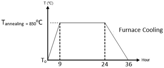 The purpose of the annealing process was to diffuse the BST solution with the substrate. The annealing process was conducted gradually using a VulcanTM-3-130 model furnace. The heating began at room temperature and was raised to the required annealing temperature, 850 °C, with an adjusted temperature rise (1.7 °C/min), and then the annealing temperature was maintained for 15 h. Next, furnace cooling was conducted until room temperature was reached again []. The annealing process can be seen in Figure 3.