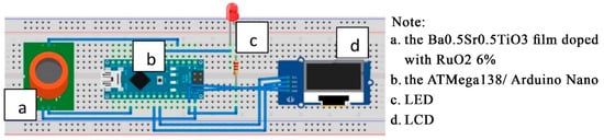 The components used in the bad-breath detector prototype consisted of the input component, the processing component, and output component. The input component is shown in Figure 7, label ‘a’, the Ba0.5Sr0.5TiO3 film doped with RuO2 6%. The processing component used a 10-bit microcontroller (Figure 7, labeled ‘b’), the ATMega138/Arduino Nano which is 3 × 1 cm2 in size. The output component (Figure 7, labeled ‘c’ and ‘d’), the LED as the indicator and an LCD as the voltage value and breath odor condition display.