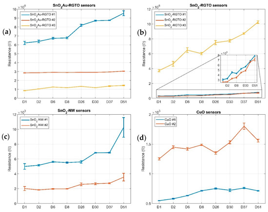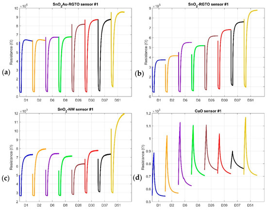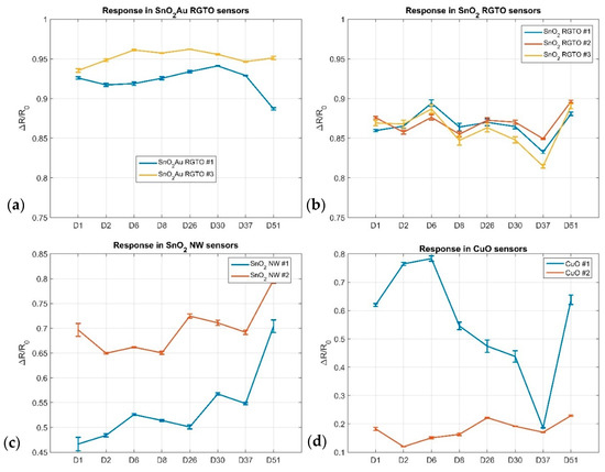 ΔR/R0 for all the sensors from day 1 to day 51. (a) Response of 2 out of 3 SnO2Au RGTO sensors; (b) response of the 3 SnO2 RGTO sensors; (c) response of the 2 SnO2 NW sensors; (d) response of the 2 CuO sensors.