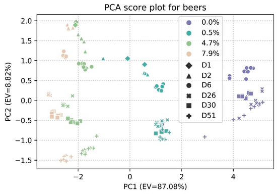 PCA score plot for beer samples. Total explained variance (EV) equal to 95.9% from the first two principal components (PC1 EV = 87.08%, PC2 EV = 8.82%). Colors indicate the different ABV of the samples, markers denote different days (from 1 to 51).