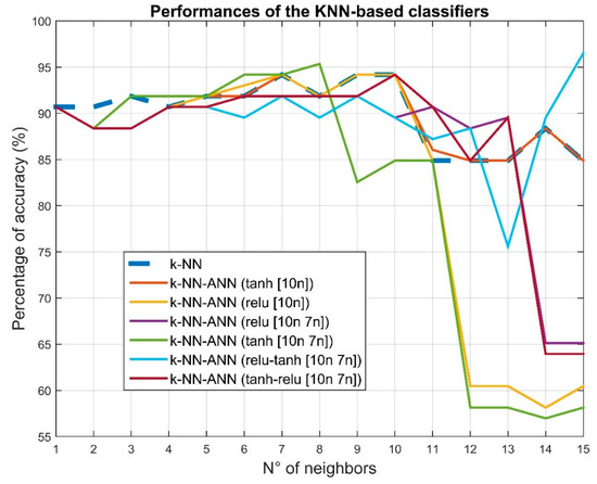 From PCA, a subset of 3 features has been chosen to optimize the classification task. In detail, SnO2Au RGTO #1 and the two SnO2 NW sensors have been selected. Percentages of accuracy are shown in Figure 5. k-NN performances have been highlighted with a thicker and dashed line to better understand if the ones of the hybrid method could get over them.