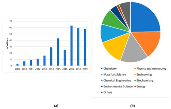 Data from Scopus.com in the last 10 years (2009–2019) for the keywords “silver nanoparticles as colorimetric sensors”: (a) Number of publications per year; (b) Subjects areas involved in this research field.
