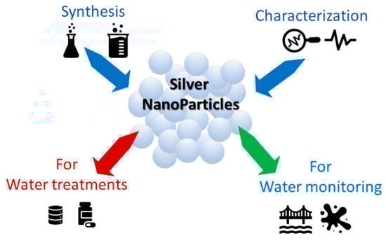 The authors’ choice was not to treat the aspects and applications of silver particles concerning their antibacterial properties, but rather the synthesis, characterization and main optical properties in the visible range of silver nanoparticles suitable for water pollutant monitoring and treatment, are presented, as schematized in Figure 2. The advantages and strategies of the recent silver-based materials, used for heavy metal and pesticides detection and water treatments, are examined, taking into account their dimensions, functionalization, selectivity and low detection limits (LODs). In fact, it is often enough to vary just a few experimental parameters to obtain systems with different selectivity and sensitivity. This is also demonstrated by the different reviews that have appeared in recent years and that often discuss how the same analyte can be simply monitored with systems based on different silver nanoparticles. All this, if on one side is an advantage, linked to the high versatility of the chemical synthesis, on the other it can be confusing. Starting from these assumptions, our work examines the recent literature on silver nanoparticles used as colorimetric detection materials for main water pollutants, to provide readers with a clear unique and updated guide.