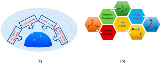 Many approaches are used to functionalize the metal surface, as schematized in Figure 3a: (a) the ligand exchange strategy; (b) stabilization during the synthesis with a ligand with sulfur or nitrogen; (c) stabilization during the synthesis with two or more ligands; (d) stabilization during the synthesis with ligands with more functional groups [35,47,76,77,78]. The first approach, ligand exchange, is the simplest and most economic way to functionalize the silver surface. On the other hand, this functionalization method often displays poor control and reproducibility, because it is based on an equilibrium reaction associated with the Nernst distribution and depends on several parameters, such as the repeated exchange reactions with a large ligand excess, the diameter of the silver nanoparticles, and ligand steric hindrance. The presence of ligands during the synthesis allows for strict control of the surface coverage and guarantees the reproducibility, even if sometimes at the expense of the yield. Moreover, the presence of more ligand or more functional groups can be useful for post-synthesis engineering strategies. Indeed, some functionalities remain towards the outside of the particle and have a great ability to create a network between particles and interact with the external environment. Commonly, hydrophilic functionalities such as acid, amine, ester, alcohol are mostly preferred (Figure 3b).