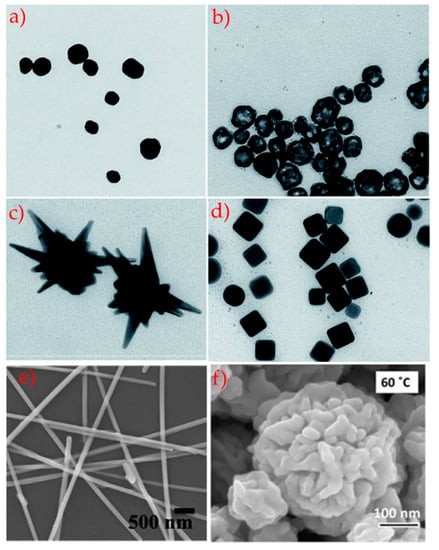 The morphology plays a key role, especially for the possibility of having materials with different symmetries (spheres, AgNPs, cubes AgNCs) [79,80,81,82,83,84,85,86,87] or without defined and reproducible symmetry (stars, AgNSs, flower, AgNFs, wires, AgNWs) [69,88,89,90,91,92,93,94]. TEM images of silver nanoparticles of different geometries and shape are presented in Figure 4. The nanospheres, highly symmetrical particles, are the most studied because of their monodispersity and synthetic reproducibility, that assure the repeatability of experiments and results. Spherical AgNPs and their composites have a widely application range, mostly in biotechnology and sensors [79,80,81,85,95,96]. The AgNPs show a typical localized surface plasmon resonance (LSPR) whereby the electrons on the AgNPs surface interact with electromagnetic radiation, generating LSPR and producing extinction and scattering spectra, with absorption bands in the 370–470 nm range. Moreover, the opportune choice of surface functionalization and the presence of chemical or biological analytes can stimulate the aggregation-disaggregation phenomena, associated with LSPR band changes. Also, hollow spherical silver nanoparticles have an important role in biotechnological applications due to their role as fillers or rheological modifiers and easy synthesis [97]. In fact, the void space in hollow structures can be efficaciously used to capture specific molecules, and so their impact can be assessed in terms of density, volume fraction and dimension. On the other hand, the void area has been used to tune the refractive index, increase the active region for catalysis, and advance the ability to tolerate cyclic volume modifications.