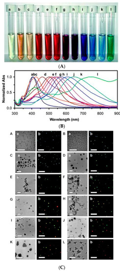 The change of color of colloidal solution depending on size and shape of silver nanoparticles in (A) and related optical absorption spectra (B); (C) The Figures (A–L) show the TEM images (a) related to the different shapes of Ag nanosystems and the NPs imaged under optical diffraction limit (b). The scale bars in (a) are 40 and 100 nm for (A–H) and (I–L), and 10 μm in (b), respectively. The scale bars in (b) represent the distances among NPs, but not the sizes of NPs [109].