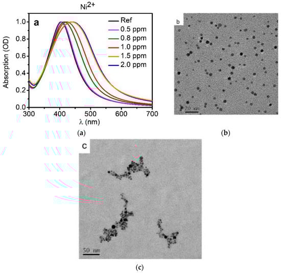 (a) Optical behaviour of AgNPs colloidal solution without (black line) and with different Ni(II) contaminations (colored lines); TEM images of (b) AgNPs and (c) the system contaminated by Ni(II) [112].