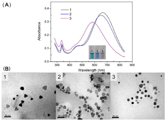 (A) UV-Vis spectra of (1) silver nanoprisms, (2) with 700 nM of Hg (II) and (3) with 1500 nM of Hg (II). (B) TEM images of (1) AgNPs, (2) with 700 nM of Hg (II) and (3) with 1500 nM of Hg (II) [116].