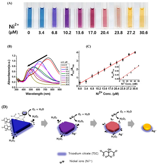 (A) Color change of the triangular silver nanoprisms upon addition of 10 different concentrations of Ni (II) (0.0 to 30.6 μM) at pH 8 and 15 °C; (B) UV-vis absorption spectra of the colloidal solutions as a function of Ni (II) concentration; (C) absorption ratios (A475/A750) from the UV–vis absorption spectra as a function of the Ni (II) ion concentration (0.0 to 30.6 μM). The inset shows the same absorption ratios but for lower concentrations of Ni (II); (D) The sensing mechanism of citrate-capped triangular AgNPrs for Ni(II) ions. (Reference. [127]).