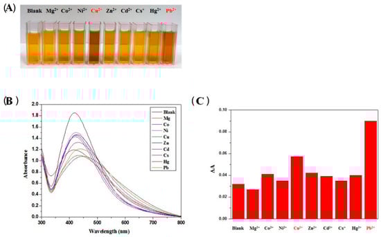 (A) solutions of polymerized 3,4-dihydroxy-L-phenylalanine silver NPs in presence of different metal ions with concentration of 0.1 µM: in red the metal ions which induce color variation, i.e., Cu (II) and Pb (II); (B) UV-Vis absorption spectra of the colloidal solutions after mixing with 0.1 µM metal ion; (C) absorption ratio of the solutions with various metal ions (Reference [131]).