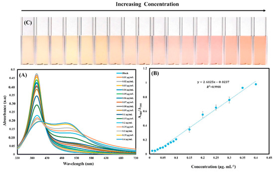 A simple and green method for preparing uniform silver NPs exploiting self-polymerized 3,4-dihydroxy-L-phenylalanine as the reducing and stabilizing agent in aqueous media has been recently reported [131]. The functionalized silver NPs showed selectivity for Pb (II) and Cu (II) detection, as reported in Figure 9, with LOD for the two ions as low as 9.4 × 10−5 and 8.1 × 10−5 M, respectively. The sensing mechanism is based on the aggregation of functionalized AgNPs in presence of Pb (II) and Cu (II) as reported by the authors with TEM images. Therefore, the change in the solution color and the observed intensity ratio in Figure 9C are associated with the aggregation behavior of the AgNPs.