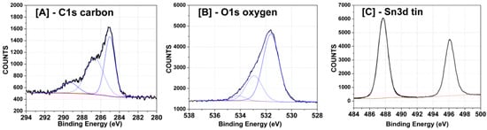 High-resolution X-ray photoelectron spectroscopy (XPS) spectra were collected to determine the nature of the chemical bonding in the SnO2-rGO nanocomposite material. Regions of the spectra for elements of interest were fitted and deconvolved. Figure 4A shows that the C1s peak between 283 eV and 292 eV possesses contributions from three separate peaks, indicating the presence of C atoms involved in carboxyl, ether-like C-S, and C-C bindings, respectively. The O1s peak between 529 and 536 eV in Figure 4B in turn indicates the presence of carbonate and hydroxide groups and metal oxide bonds. Finally, the Sn3d region of the spectrum in Figure 4C displays two peaks centered at 487–488 eV and 496 eV, which are attributed to Sn 3d electrons with 5/2 and 3/2 spins, respectively, and are typical for SnO2-graphene composites [22].