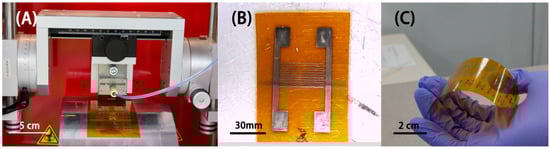 The printing and coating techniques were used in this work to fabricate an electronic sensor for CO mainly due to their high-throughput and the possibility of making a device through a large-area scalable process [6]. Interdigitated electrode structures (IDE) were used, since they afford an increased active area for relatively small resistance-based devices. In this case, inkjet is an appropriate printing method for allowing the high-resolution printing of flexible metal traces using commercially available nanoparticle-based inks [25]. Arrays of high-resolution, flexible Ag IDEs were printed on PET and Kapton, with an example shown in Figure 5A. The line-width and spacing for the digits were both around 100 µm, the thickness was between 300 and 400 nm, and the resistivity after sintering was 3.52 × 10−5 Ω·cm (22.1% of pure Ag).