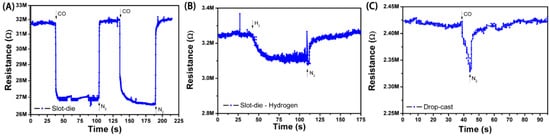 Detection curves for: (A) slot-die coated film of SnO2-rGO against CO; (B) slot-die coated film of SnO2-rGO against H2; (C) drop-cast film of SnO2-rGO against CO.